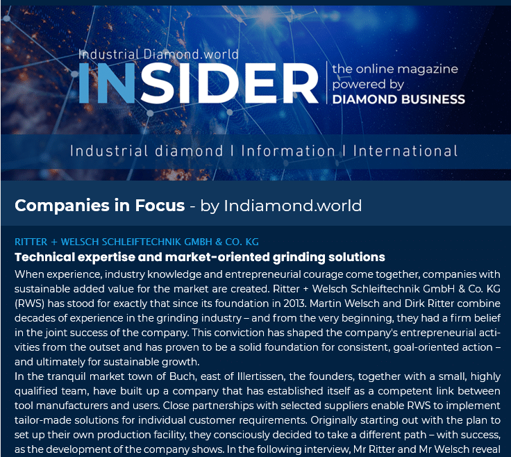 In der Print-Ausgabe 1/2026 der DIAMOND BUSINESS erschien ein Firmenportrait über Ritter + Welsch. Online ist der Fachartikel ebenfalls unter www.indiamond.world verfügbar. Lesen Sie wie es zur Gründung kam, für welche Werte die Inhaber stehen, wie das Unternehmen ausgerichtet ist und wohin die Schleifbranche sich entwickeln wird.
